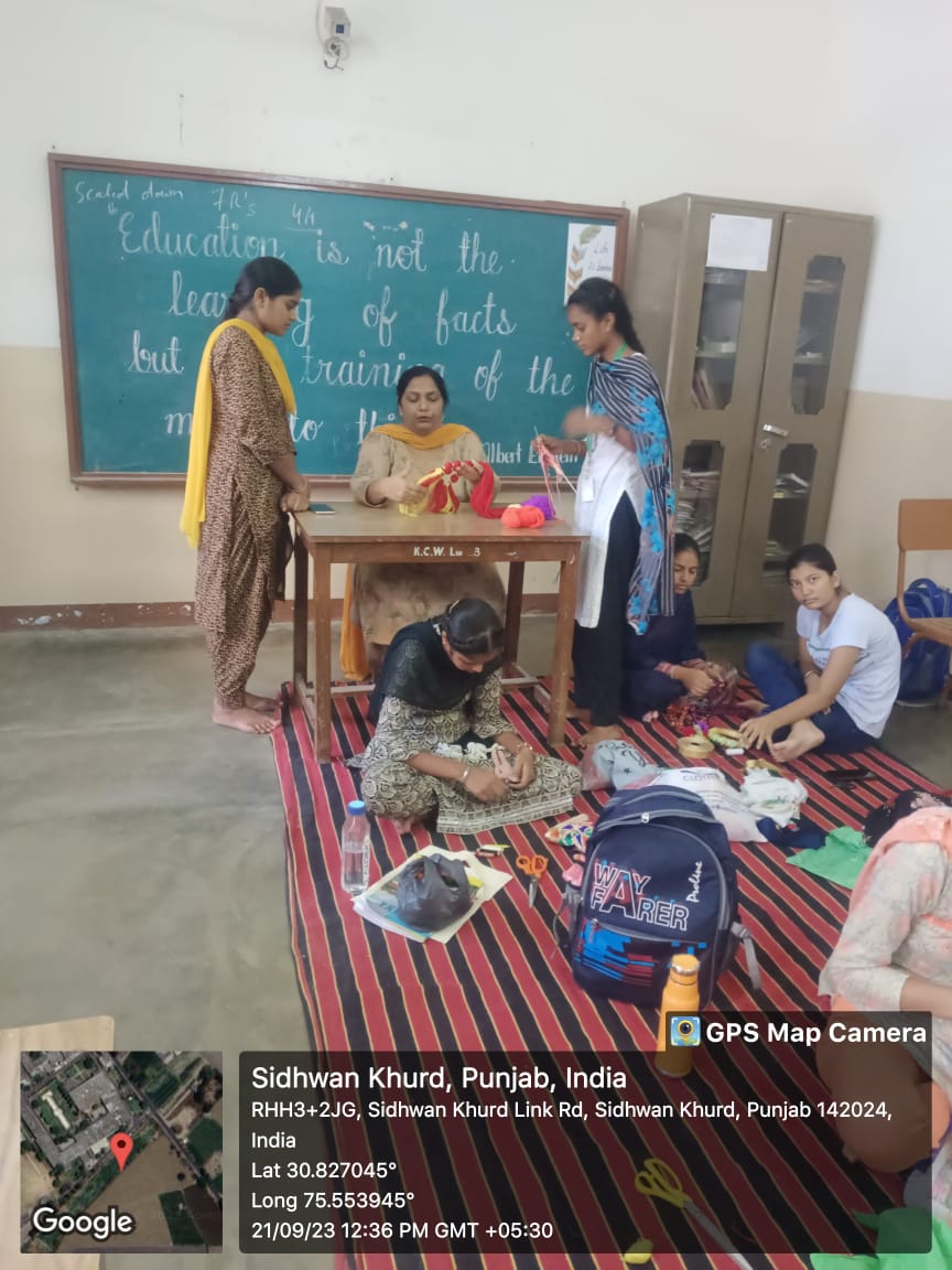 Fine Arts Society of Khalsa College for Women, Sidhwan Khurd organized 15 Days Workshop on Heritage Craft Items from September 7 to 21, 2023 for students. The Resource Person was Mrs. Harjeet Kaur, Instructor, Art and Craft from GHG Harparkash College of Education, Sidhwan Khurd and taught the students to make Guddian Patole, Chhikku, Pranda, Naala, Tokri, Mitti De Khidaune, Khiddo, Peehri, Rassa, Eeennu and traditional embroidery designs. 46 students were given demonstration to make various items. Hands on training was provided and the participants enthusiastically created beautiful articles and patterns. Dr. Amandeep Kaur, Principal (Addl. Charge) of the college congratulated the students on the successful completion of the workshop. She said that such endeavours can preserve our rich and varied cultural craft forms that have been handed down through generations but are fast becoming extinct. The youth can contribute to conserve valuable traditional skills and adopt these as a vocation. She praised the Fine Arts Society for its efforts.