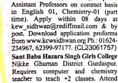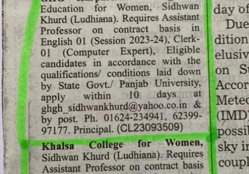 Applications are invited for the post of Assistant Professor on contract basis in English -01 ,Chemistry -01 for the session 2023-24 , Clerk -01(Computer Expert)