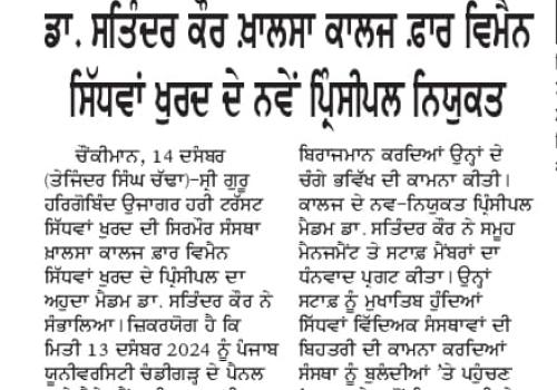 On 13 December, 2024, Dr. Satinder Kaur took charge of Principal, Khalsa College For Women, Sidhwan Khurd, premier rural women education institution under the guidance of the Honourable Management of SGHGU Hari Trust.
