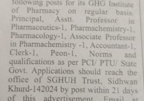 SGHUH Trust,Sidhwan Khurd Ludhiana invites applications for various posts for its GHG Institute of Pharmacy on regular basis