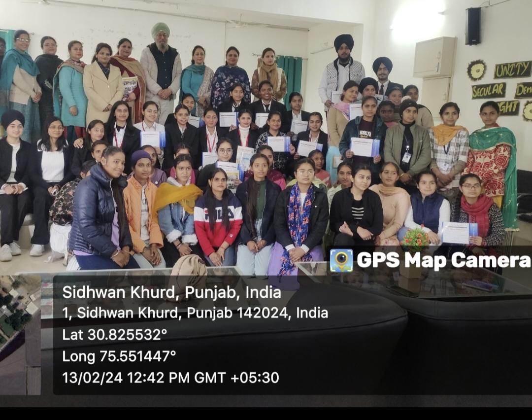 Under the able guidance of Principal Dr. Amandeep Kaur the students of KCW Sidhwan Khurd brought laurels in various competitions conducted by Guru Gobind Singh Study Circle, Ludhiana. On 28 January 2024,Women Council of Guru Gobind Singh Study Circle organised ‘Dooja Istri Kavi Darbar’ at Sultanpur Lodhi. Manpreet Kaur, BA 1 participated in this event and was honoured with a Certificate, Trophy and set of religious books. On 13 February 2024, the certificates were awarded to the students, who appeared for the exam of Moral Education conducted by Guru Gobind Singh Study Circle, Ludhiana. This exam was conducted with the support of Gurudwara Committee of the College. Total 26 students appeared in this exam. Gurneet Kaur, BA 2 secured special prize in this exam. She was given a Certificate, Trophy and cash prize of Rs. 100/. On this occasion, the Zonal Secretary of Guru Gobind Singh Study Circle, Ludhiana S. Jaspal Singh also shared his thoughts with the students. He said that Education based on Ethical values is very important in building the personality of the students. On 15 February 2024 Guru Gobind Singh Study Circle, Ludhiana organised Ludhiana Zone Youth Festival wherein Simrandeep Kaur of B.Sc.lll got special prize in Speech competition and was awarded with a Certificate, Trophy and books. Manpreet Kaur of BA I got certificate of participation. The college Principal Dr. Amandeep Kaur congratulated the winner students, their parents and teacher incharges.