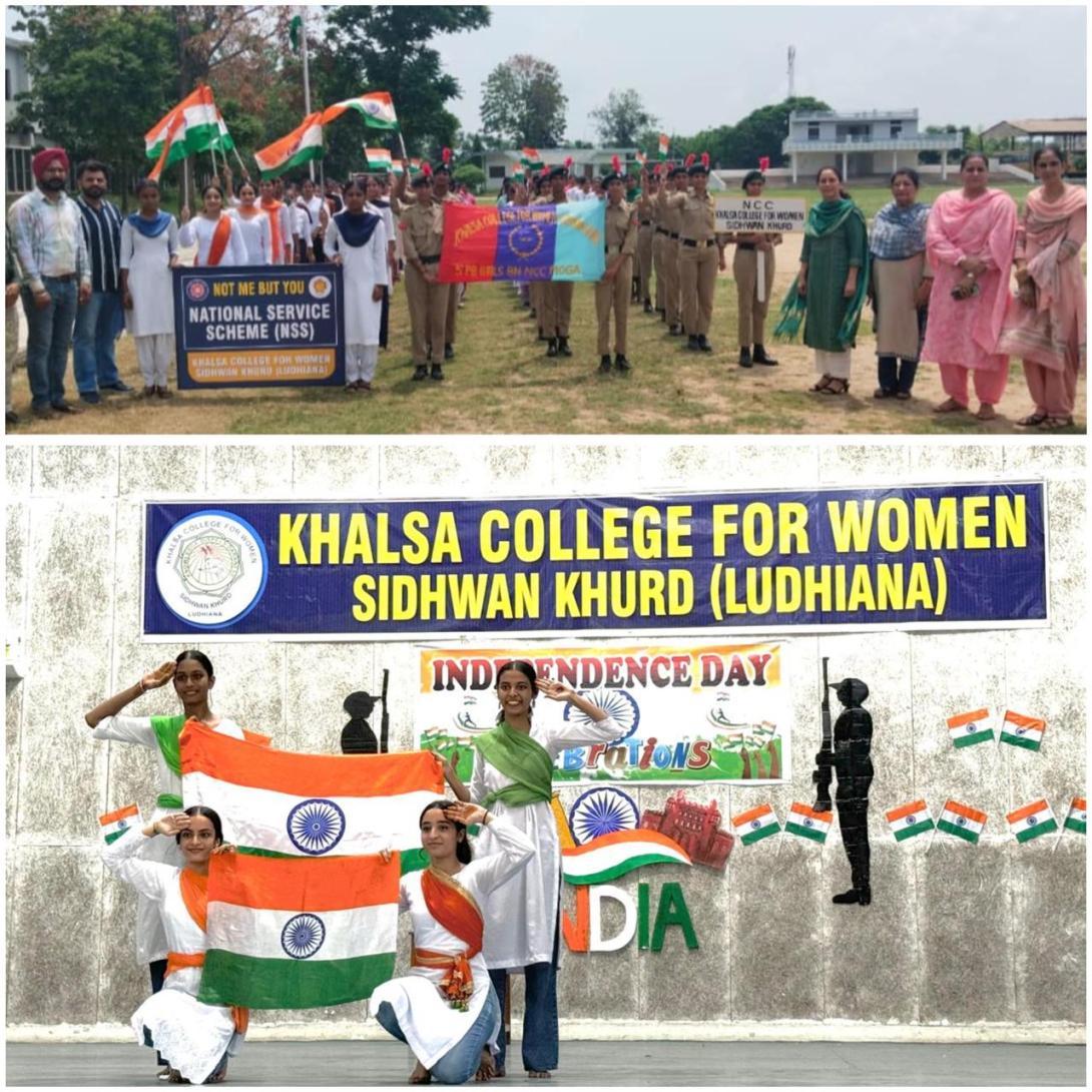 As per the directions of Ministry of Youth Affairs and Sports Directorate of NSS Independence Day was jointly organized by the NSS Units, NCC Unit and Social Sciences Forum under the aegis of  ' Har Ghar Tiranga Campaign’ at Khalsa College for Women, Sidhwan Khurd on Augyst 14, 2024. Flag Hoisting ceremony was conducted. Dr. Amandeep Kaur, Principal (Addl.Charge) unfurled the National Flag. The staff and students recited the National Anthem. A programme dedicated to this historic day comprising of patriotic group songs, group dances eulogizing the sacrifice of the martyrs and celebrating the greatness of the motherland were presented. Speeches on the glorious history of freedom struggle, symbolic significance of the colours of National Flag were delivered. Dr. Navdip Kaur HoD PG Department of History spoke on the contribution of female revolutionaries by highlighting the contribution of Sarla Devi Chaudharani. She also stressed on the role of punjabis in  Gadhar Movement, Azad Hind Fauj and various other endeavours. She dwelt upon the tragedy of partition that happened along with the Independence of India by quoting Faiz Ahmed Faiz and other poets. She said that there  are many contemporary challenges in the path of realization of the dreams envisaged by our freedom fighters.  She shared an interesting anecdote related to Sohan Singh Bhakna inspiring the students to maintain focus. Dr. Amandeep Kaur addressed the audience and congratulated all on this auspicious occasion. She said that the sacrifice and sufferings faced by the martyrs who could not be there to see the dawn of Independence and our security forces guarding us should be acknowledged so that we can realize it and continue our efforts in maintaining our hard won freedom. She said that liberty comes with great responsibilities. Prof. Karamdeep Kaur conducted stage proceedings effectively. Dr. Inderjit Kaur NSS Programme Officer proposed the formal vote of thanks. NSS Volunteers who won prizes in various competitions conducted under the aegis of Swachhta Abhiyaan were felicitated.