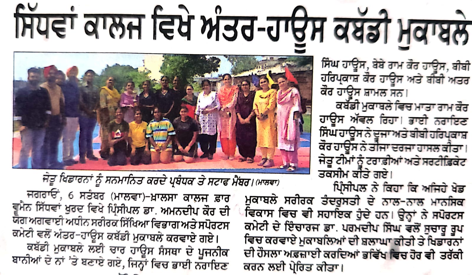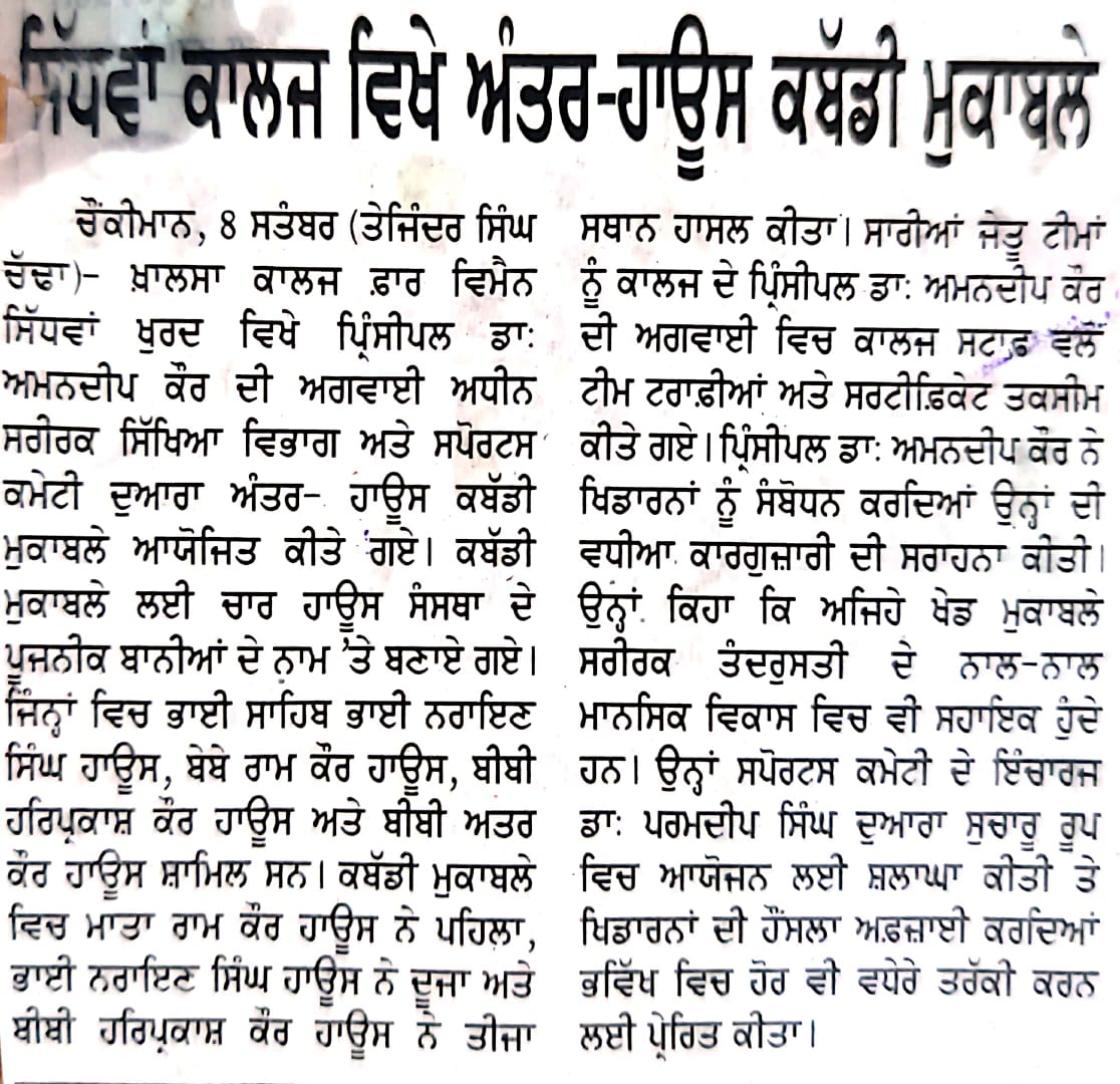 Under the able guidance of Dr. Amandeep Kaur, Principal (Addl. Charge) Sports Committee of Khalsa College for Women Sidhwan Khurd organized Inter House Kabaddi Tournament on September 6, 2024 to commemorate life and contribution of Major Dhyan Chand whose birth anniversary is celebrated annually as National Sports Day on August 29. Four Houses christened after the names of the founders of the institution namely Bhai Narain Singh, Mata Ram Kaur, Bibi Harparkash Kaur and Bibi Attar Kaur have been constituted. The event commenced with the hoisting of the college flag Mata Ram Kaur House stood first. Bhai Naraian Singh House and Bibi Harparkash Kaur House bagged the second and third position respectively. Trophies were given to teams securing first, second and third position. Participation certificates were awarded to all the players. Dr. Amandeep Kaur congratulated the winners and said that participation in sports is indispensable for the all round personality development of the students. She said that a sound mind resides in a healthy body. Such competitions are also an avenue for students to display their physical prowess and skill at playing various games. She praised the efforts of Dr. Paramdeep Singh, incharge of the event and Sports Committee for the success of the tournament.