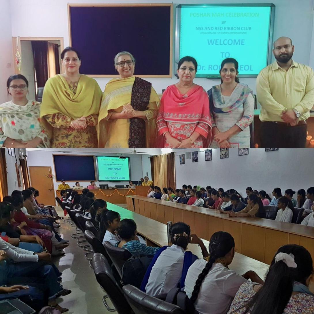 Under the able guidance of Principal Dr. Amandeep Kaur, NSS Units and Red Ribbon Club of Khalsa College for Women, Sidhwan Khurd observed 7th Rashtriya Poshan Maah on the theme ‘Poshan Bhi Padhai Bhi’. Mrs. Hardeep Kaur, welcomed the resource person of the day Dr. Roohi Deol Obstetrics and Gynecology specialist, Deol Hospital, Mullanpur. An informative lecture on the importance of maintaining a balanced diet for overall health and well being was delivered by the resource person. She emphasized the significance of consuming a variety of food groups including fruits, vegetables, whole grain and lean proteins. She also touched on the link between a healthy diet which improves mental health particularly by reducing symptoms of anxiety and depression. Formal vote of thanks was presented by Dr. Navdip Kaur. She thanked Dr. Roohi for her humble expression and the valuable information shared by her.