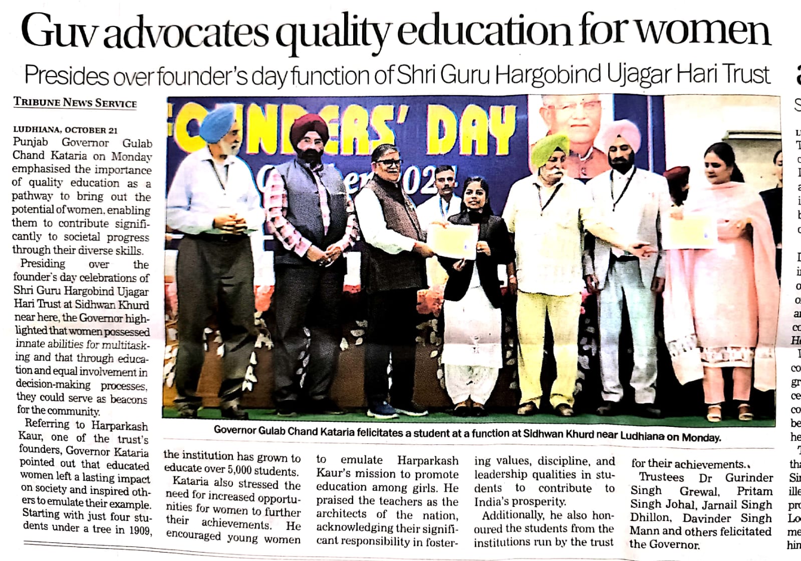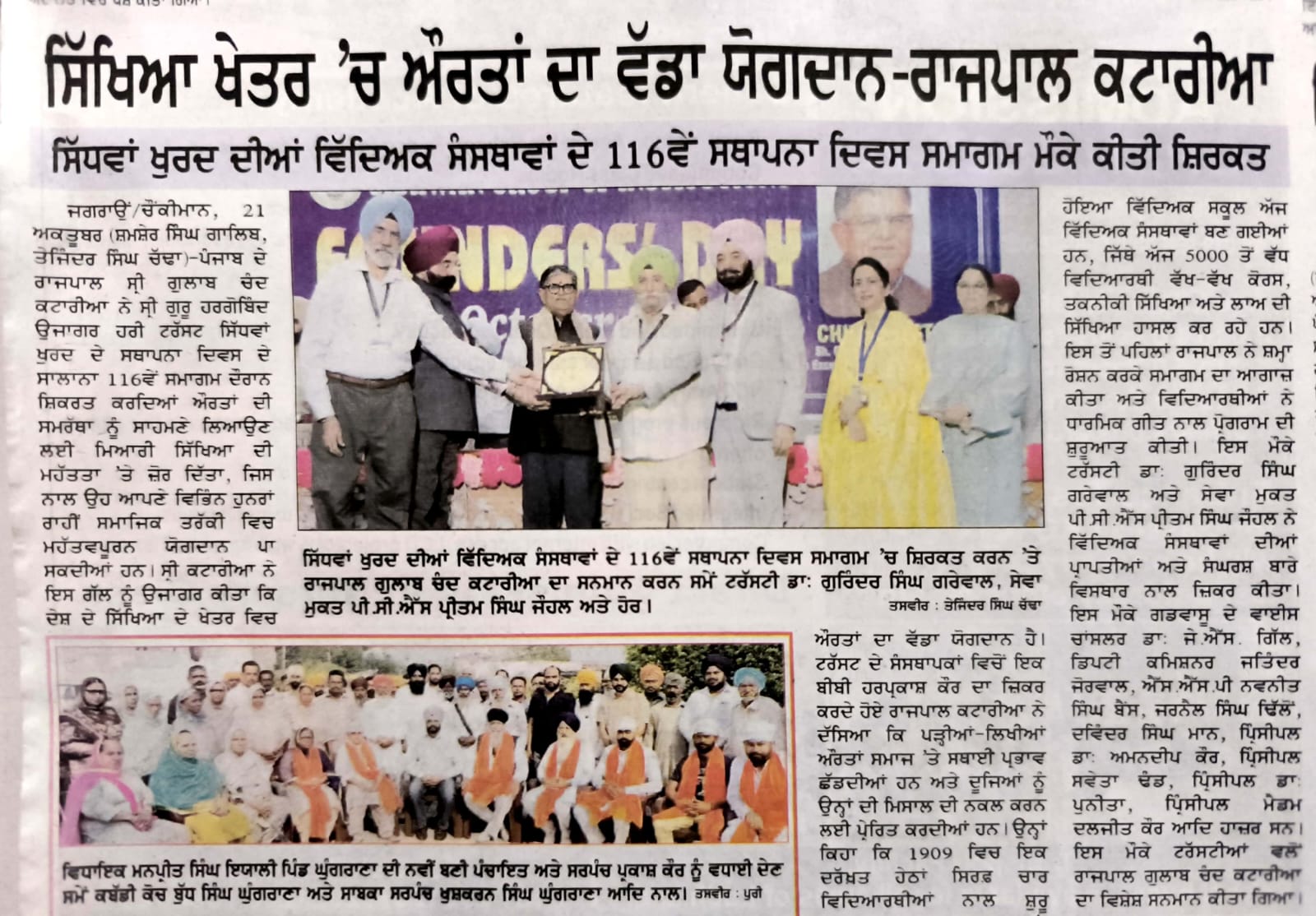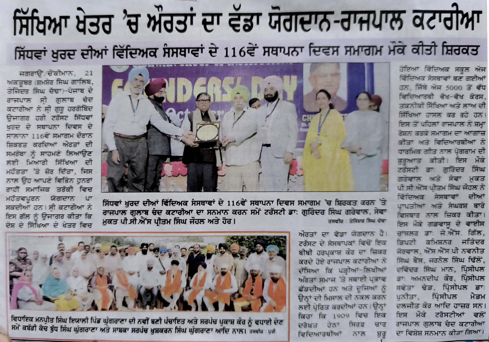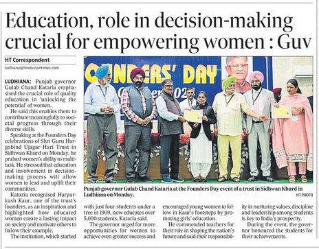 Under the aegis of SGHGU Hari Trust Sidhwan Group of Institutions celebrated Founders’ Day on October 21, 2024 to commemorate the legendary donors Bhai Narain Singh Ji, Bebe Ram Kaur Ji , Padam Shri awardee Bibi Harparkash Kaur Ji and Bibi Attar Kaur Ji who bequeathed the golden legacy of service to the cause of female education. His Excellency Governor of Punjab, Shri Gulab Chand Kataria graced the occasion as Chief Guest. Guard of Honour was presented to him. He exhibited his veneration for the Founders by paying floral tributes.The programme commenced with the Bhog Ceremony of Sehaj path at the campus Gurudwara Sahib. Hazoori Ragi , Shri Harmandir Sahib, Bhai Gurjinder Singh and his Jathha recited Shabads and imbued the atmosphere in spiritual fervour with soulful renditions. Students revered the memory of the pioneers by singing Shabads, Poetical Recitation, Kavishri and speeches. The programme continued at Guru Nanak Bhawan where the Chief Guest was greeted with a bouquet. Lamp Lighting Ceremony was conducted. Honourable Manager, SGHGU Hari Trust, Dr. GS Grewal accorded a ceremonial welcome to the distinguished personalities. He shared the illustrious history of Sidhwab Group of Institutions and highlighted the contemporary achievements. Bani Diwas Scholarships were awarded to the students who excelled in academic, religious, sports and cultural activities. 57 students were given Scholarships amounting to rupees One Lakh Eighty Nine Thousand. Prizes were given to student achievers. Student of the year awards were given to Garima Sharma of Khalsa College for Women, Rupinder Kaur of GHG Harparkash College of Education for Women, Ayusha of GHG Institute of Law, Prabhnoor Kaur and Navjot Kaur of Sikh Girls Senior Secondary School and Sherry Mann of GHG Public School. Shri Gulab Chand Kataria , esteemed Governor of Punjab paid homage to the visionary Founders and said that it was a matter of immense pride for him to visit a place where women education was introduced in a village when it was a rarity in urban areas. He congratulated the Management, staff and students who were contributing to a noble cause. He emphasized the role of the teacher as a ' guru' and said that "guru" has been accorded the highest status in Indian society. S. Pritam Singh Johal, Secretary, SGHGU Hari Trust expressed gratitude to the Chief Guest for adorning the event with his gracious presence. S. Pritam Singh Johal, Dr. GS Grewal and Management members S Devinder Singh Mann and S Jarnail Singh Dhillon along with the Principals of the educational institutions under the aegis of SGHGU Hari Trust felicitated Shri Gulab Chand Kataria. The Chief Guest paid homage at the campus Gurudwara and Siropa Sahib was presented to him. Dr. JPS Gill , Vice Chancellor, GADVASU ensured his distinguished presence. Everyone partook Langar.