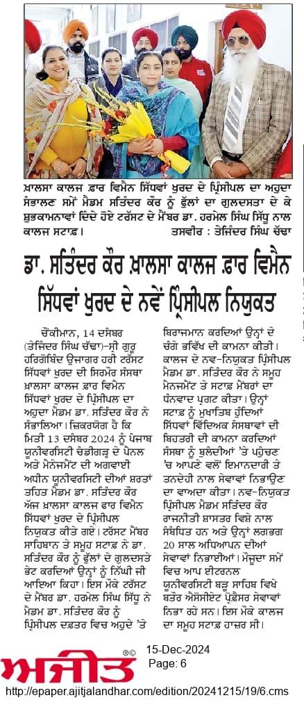 On 13 December, 2024, Dr. Satinder Kaur took charge of Principal, Khalsa College For Women, Sidhwan Khurd, premier rural women education institution under the guidance of the Honourable Management of SGHGU Hari Trust.