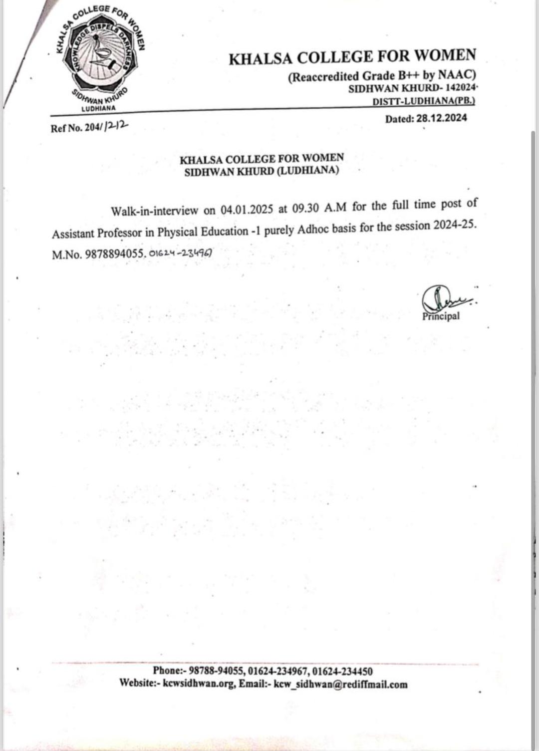 Walk-in interview for the post of Assistant Professor in Physical Education
