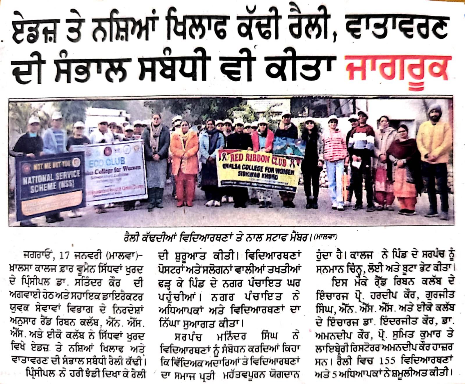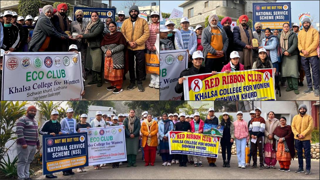 As per the instructions of the Assistant Director, Department of Youth Services, Ludhiana, an awareness rally on Environment Conservation, Drug Awareness and HIV/AIDS was successfully conducted by Khalsa College for Women, Sidhwan Khurd in Sidhwan Khurd Village on January 16, 2024. The rally aimed to educate the community on crucial environmental and social issues while inspiring action for a healthier and sustainable future. The College esteemed Principal Dr. Satinder Kaur inaugurated the rally, delivering an inspiring message that emphasized the power of collective action and the vital role of youth in fostering environmental and social change. A total of 155 students, along with 5 teachers, actively participated in the rally. Students carried creative posters with powerful messages about environmental protection, the dangers of drug addiction, and preventive measures for HIV/AIDS. As the rally proceeded through the village, participants engaged with residents, initiating meaningful conversations and spreading awareness. Villagers, especially the youth, appreciated the initiative and pledged their support for these causes. The rally organizers honored Village Sarpanch, S. Maninder Singh, with a sapling and a memento, acknowledging his efforts in supporting social and environmental initiatives. The occasion was graced by the presence of Panchayat members. The rally was coordinated under the guidance of the NSS and Eco Club incharges, Dr. Inderjit Kaur and Dr. Amandeep Kaur, along with the Red Ribbon Club incharges, Mrs. Hardeep Kaur and Mr. Gurjeet Singh. The initiative concluded with an encouraging response from the community, reflecting the impact of collaborative efforts in addressing vital social and environmental issues.
