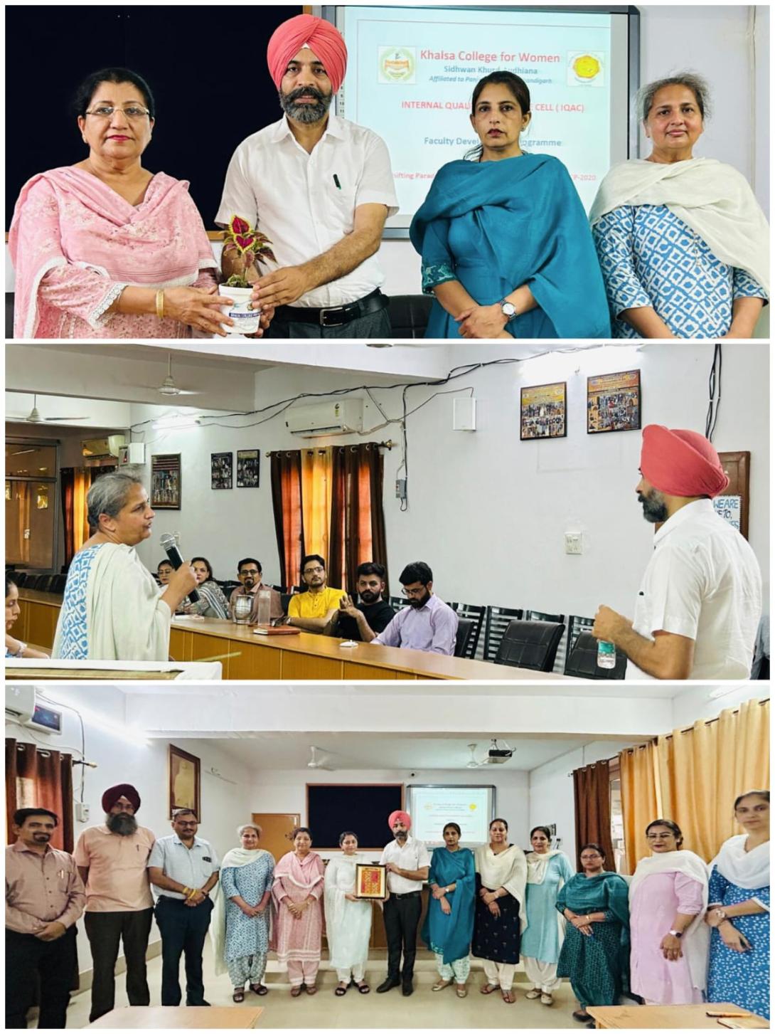 Under the guidance of Shri Guru Hargobind Ujjagar Hari Trust and the unwavering support of Principal Dr. Satinder Kaur, the third day of the Faculty Development Program was successfully held on 29 May, 2025 focusing on the theme “Effective Teaching-Learning Strategies”. The event was held as part of the ongoing celebrations of the 75 glorious years of academic excellence. The resource person for the session was Dr. Pargat Singh Garcha, Principal of GHG Khalsa College of Education, Gurusar Sudhar. The session began with a warm welcome of the resource person by Vice Principal Dr. Navdip Kaur and senior faculty members. In his address, Dr. Garcha shed light on various contemporary teaching methodologies. He spoke about blended modes of instruction, flipped classroom models and the relevance of Education 4.0. Emphasizing the role of AI tools in enhancing teaching-learning processes, he also highlighted the significance of cultivating a positive attitude among educators to adapt to the changing educational landscape. A memento and a sapling were presented to the resource person as a token of appreciation and a symbol of growth and sustainability. Stage proceedings were conducted by Dr. Paramjit Kaur and the session concluded with a vote of thanks by IQAC coordinator Prof. Roopa Kaur Rai who acknowledged the resource person for his insightful and motivating session. The session inspired educators to embrace technological advancements and innovative pedagogies, reaffirming their commitment to student-centric and quality education.
