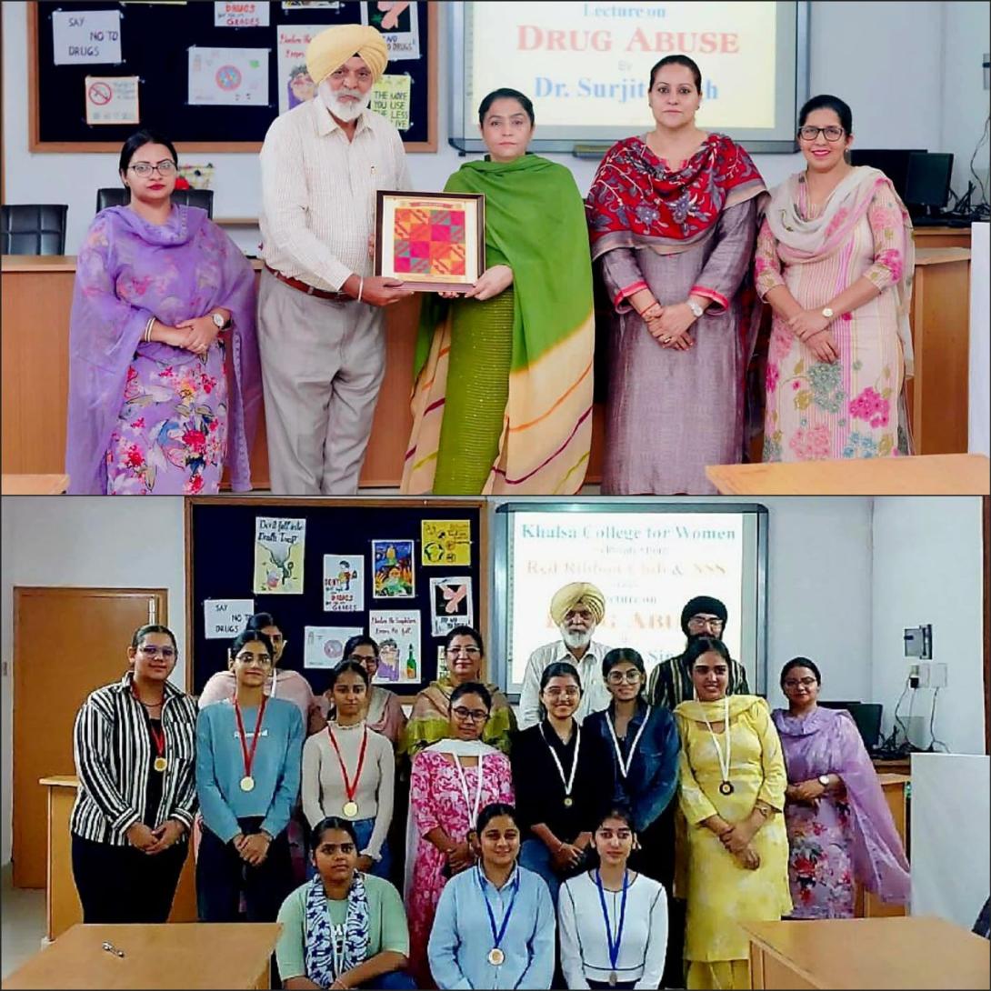 Under the aegis of Shri Guru Hargobind Ujagar Hari Trust and the able guidance of Principal Dr. Satinder Kaur, the Red Ribbon Club and NSS Units of Khalsa College for Women, Sidhwan Khurd organized an Extension Lecture entitled “Drug Abuse” on 29-10-25. The resource person of the day was Dr. Surjit Singh from Govt. Inservice Training Centre, Ludhiana. He was warmly welcomed by Principal Dr. Satinder Kaur with a sapling as a token of respect and appreciation. In his thought-provoking address, Dr. Surjit Singh highlighted the psychological, social and emotional factors leading to drug addiction. He explained the adverse effects of drugs on physical health, mental balance and family relationships. He further emphasized that students can play a vital role in spreading awareness about drug prevention in society through rallies, slogan writing, poster campaigns and community interaction. He also underlined the significance of Punjabi culture and traditional values in shaping a disciplined and drug-free lifestyle, urging the youth to stay connected to their roots, moral ethics and positive community practices. Vice Principal Dr. Navdip Kaur and NSS Programme Officer Dr. Inderjit Kaur also graced the occasion with their presence. The resource person was honored with a memento and prizes were awarded to the winners of the quiz competition organized by the Red Ribbon Club. The stage was efficiently conducted by Prof. Hardeep Kaur while the event was successfully coordinated by NSS Programme Officer Dr. Amandeep Kaur along with Red Ribbon Club member Prof. Gurjeet Singh. The event served as a powerful platform to sensitize students about the harmful effects of drugs and to encourage their active participation in building a healthy, responsible and drug-free society. A total of 73 students attended the lecture with great enthusiasm.