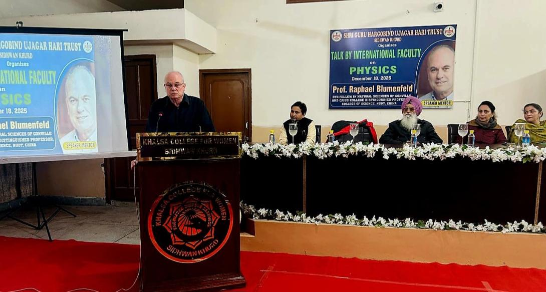 Under the aegis of Shri Guru Hargobind Ujagar Hari Trust, Sidhwan Khurd, an enlightening talk in the field of Physics by international faculty was organized on 18 December 2025 at Khalsa College for Women, Sidhwan Khurd. The resource person for the event was Prof. Raphael Blumenfeld, Bye-Fellow in Natural Sciences, Gonville and Caius College, University of Cambridge and Distinguished Professor, College of Science, NUDT, China. Honorable Dr. G. S. Grewal, Manager and S. Harmail Singh Sidhu, Member of Shri Guru Hargobind Ujagar Hari Trust, also graced the occasion. The programme formally commenced with a welcome address by Dr. Satinder Kaur, Principal, Khalsa College for Women, Sidhwan Khurd, who warmly welcomed the distinguished resource person and dignitaries. In his keynote lecture on “Granular Materials”, Prof. Blumenfeld elaborated on the behaviour of sand granules, explained the scientific principles behind silo collapses and emphasized the importance of Physics in understanding real-world and industrial phenomena. His scholarly insights made the session intellectually enriching and practically relevant. The programme was further dignified by the esteemed presence of Mrs. Frances Blumenfeld, Clinical Psychologist at the University of Cambridge and spouse of Prof. Raphael Blumenfeld, along with Dr. Sandeep Singh Grewal, Former Cabinet Secretary, Government of India. The programme also witnessed the gracious presence of eminent academicians including Mrs. Daljit Kaur, Principal, Sikh Girls Senior Secondary School; Dr. Amandeep Kaur, Principal, GHG Harparkash College of Education; Ms. Sandeep Kaur, Principal, GHG Public School and Dr. G. Pavan Kumar, Principal, GHG Institute of Pharmacy, Sidhwan Khurd, thereby adding academic prestige to the event. The rich cultural heritage of the institution, along with traditional heritage artefacts reflecting the legacy of the region, was showcased during the visit to the resource person and received high appreciation. An interactive Question–Answer session followed the lecture, during which students and faculty members actively engaged with the resource person. Prof. Blumenfeld addressed the queries with clarity and depth, making the session highly engaging and intellectually stimulating. As a mark of respect and appreciation, the distinguished guests were honoured with mementos. The programme concluded with a formal vote of thanks proposed by Dr. G. S. Grewal, Manager, Shri Guru Hargobind Ujagar Hari Trust. The stage proceedings were efficiently conducted by Dr. Gagandeep Dharni. The event proved to be highly informative and inspiring, significantly enriching the academic environment of the institution.