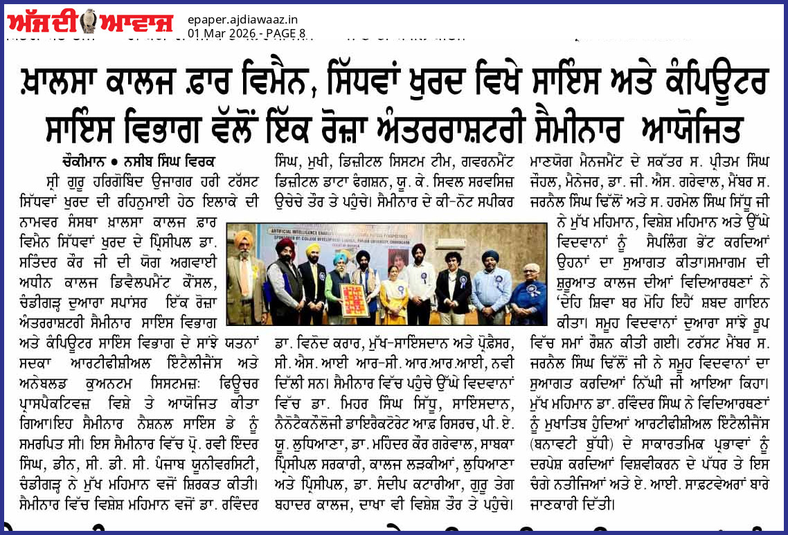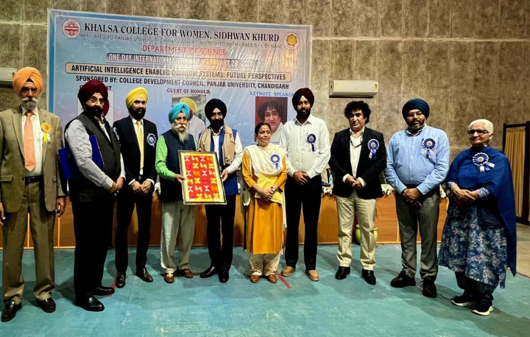 International Seminar on the theme ' Artificial Intelligence Enabled Quantum Systems: Future Perspectives ' sponsored by CDC, Panjab University , Chandigarh was organized by the Science Department of Khalsa College for Women Sidhwan Khurd on the occasion of National Science Day under the aegis of SGHGU Hari Trust and able guidance of Principal, Dr. Satinder Kaur. Dr. Ravi Inder Singh, Dean, College Development Council , PU, Chandigarh adorned the event as Chief Guest. The key note speaker Dr. Ravinder Singh, Head of the Digital and System Team, Government Digital and Data Function , UK was the Guest of Honour. The key note address was delivered by Dr. Vinod Karar, Chief Scientist and Professor , CSIR- CRRI, New Delhi. A galaxy of eminent speakers graced this confluence of minds including Dr. Mehr Singh Sidhu, Scientist, Nanotechnology, Directorate of Research , PAU, Ludhiana, Dr. Mohinder Kaur Grewal, Principal ( Retd.) , Govt. Girls College, Ludhiana and Dr. Sandeep Kataria, Principal, Guru Teg Bahadur College, Dakha who enlightened the audience. The programme commenced with invoking Almighty's blessings through Shabad Recital. This was followed by the ceremonial lamp lighting. The distinguished guests were accorded a green greeting with saplings. S. Jarnail Singh Dhillon , Honourable Member, SGHGU Hari Trust formally welcomed the distinguished personalities, delegates and participants. Dr. Ravi Inder Singh addressed the audience and said that AI is not a technology but a civilizational shift as it has penetrated all fields of life. He dwelt upon the ethical concerns of AI and inspired the students to become skilled thinkers and entrepreneurs. Dr. Vinod Karar highlighted the relevance and use of AI in various fields for enhancing human capabilities. He stressed the need to develop indigenous technology for self reliance. Dr. Ravinder Singh highlighted the applications of Quantum Computing and how it can dramatically improve the functioning of technology in future while also curbing data theft. Dr. Sandeep Kataria shared interesting anecdotes and information related to the daily impact of AI. He emphasized the need for updating ourselves to compete with evolving scientific inventions. Dr. Mehr Singh Sidhu shared the relevance and applicability of various AI tools like Perplexity, Deepseek, Gamma etc. Dr. Mohinder Kaur Grewal told about the scope of AI in Science and Technology and recited a poem on the unprecedented effects and apprehensions of AI. Paper Presentations touching upon the multiple aspects of the topic were conducted in hybrid mode. The dignitaries were felicitated with lohis and momentoes. A Power Point Presentation competition for students was organized and the winners were awarded. S. Pritam Johal , Secretary SGHGU Hari Trust proposed the formal vote of thanks. Dr. G. S Grewal , Manager and S. Harmail Singh, Senior Member respectively of SGHGU Hari Trust enriched the programme with their benign presence. Dr. Amandeep Kaur, Mrs. Daljit Kaur and Ms. Sandeep Kaur Principals of sister institutions under the management attended the event. The function concluded with singing of National Anthem. Dr. Manpreet Kaur conducted the proceedings effectively.