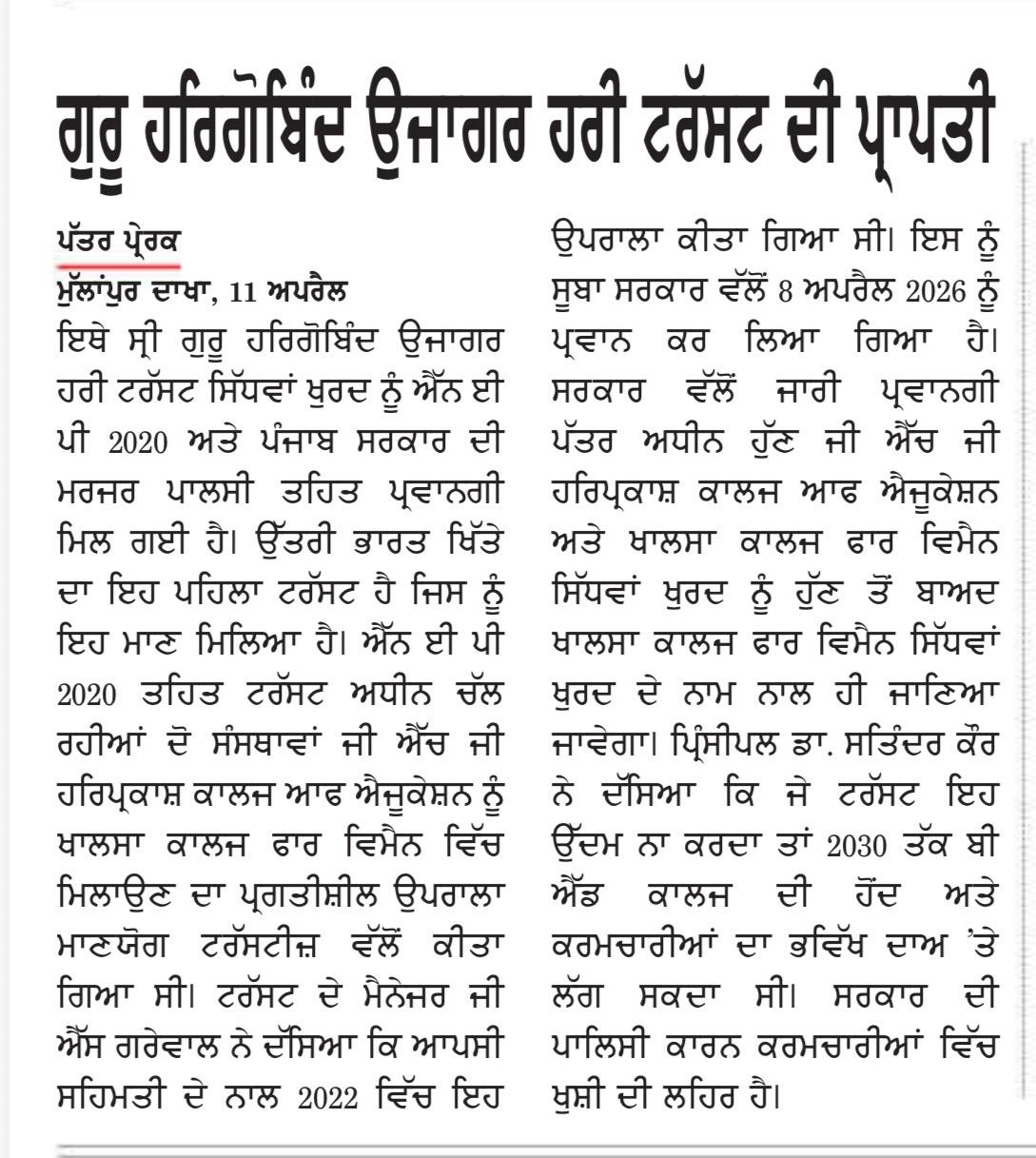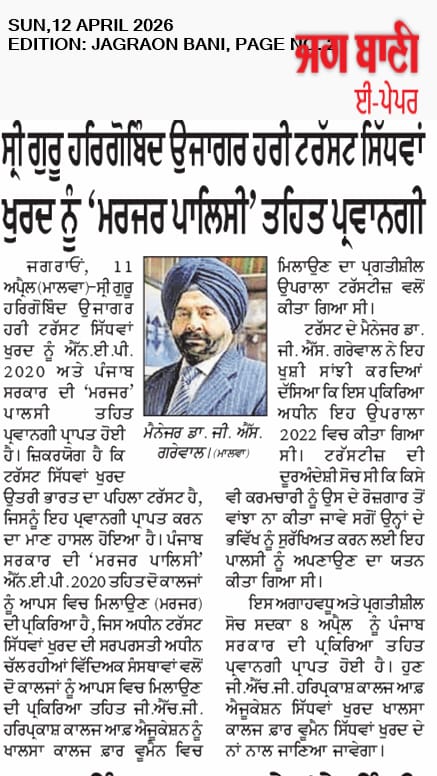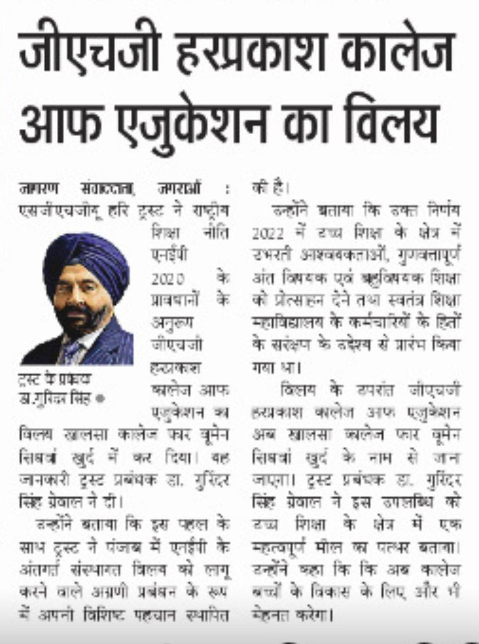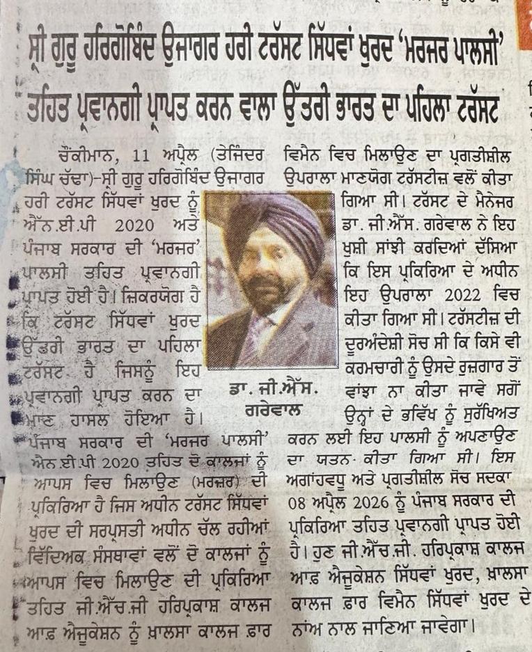 SGHGU HariTrust  earned the pride of becoming the first Management in North India as well as in the state of Punjab to implement the merger of GHG Harparkash College of Education with Khalsa College for Women, SidhwanKhurd under its aegis according to the NEP 2020 policy offering  interdisciplinary and multidisciplinary education in a single institution. This visionary endeavour was initiated by the worthy Management in the year 2022 in the light of contemporary demands  in the higher education field for fulfilling future aspirations and with the intention of safeguarding the interests of the employees of stand alone College of Education. The relentless efforts led to the fruition of the plan when the Punjab Government issued a notification for merger on April 8, 2026. GHG Harparkash College of Education will now be subsumed under the tilte of Khalsa College for Women SidhwanKhurd. Dr. Gurinder Singh Grewal, Honourable Manager of the Trust shared this information with the press.